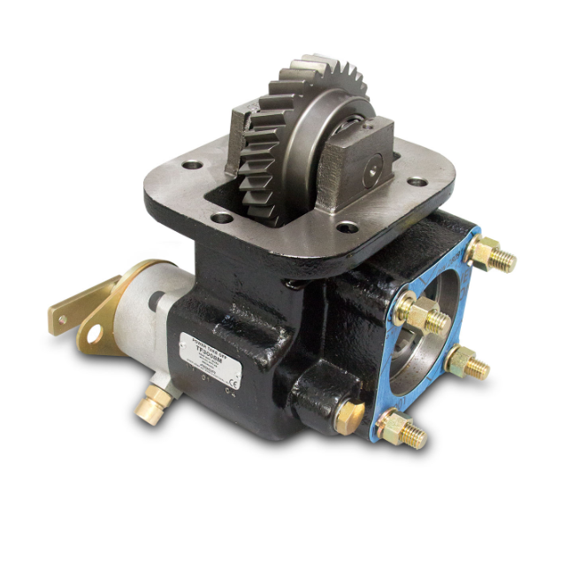 To the side of the transmission using a transmission adapter is the place where a side-mount PTO will be attached. These systems are generally installed with mounting brackets and additional parts that make installation easy. Side-mounted units engage the pto gearset through in cab controls, allowing quick PTO engagement for equipment like hydraulic pumps, hydraulic circuits, and hydraulic hoses.